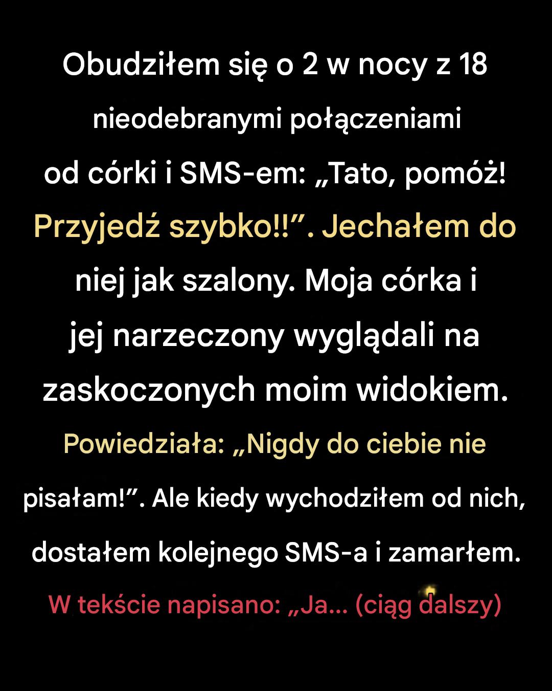 Obudziłem się o 2 w nocy z 18 nieodebranymi połączeniami od córki i SMS-em: „Tato, pomóż! Przyjedź szybko!!”. Pojechałem do niej jak szalony. Córka i jej narzeczony wyglądali na zaskoczonych moim widokiem. Powiedziała: „Nigdy do ciebie nie pisałam!”.