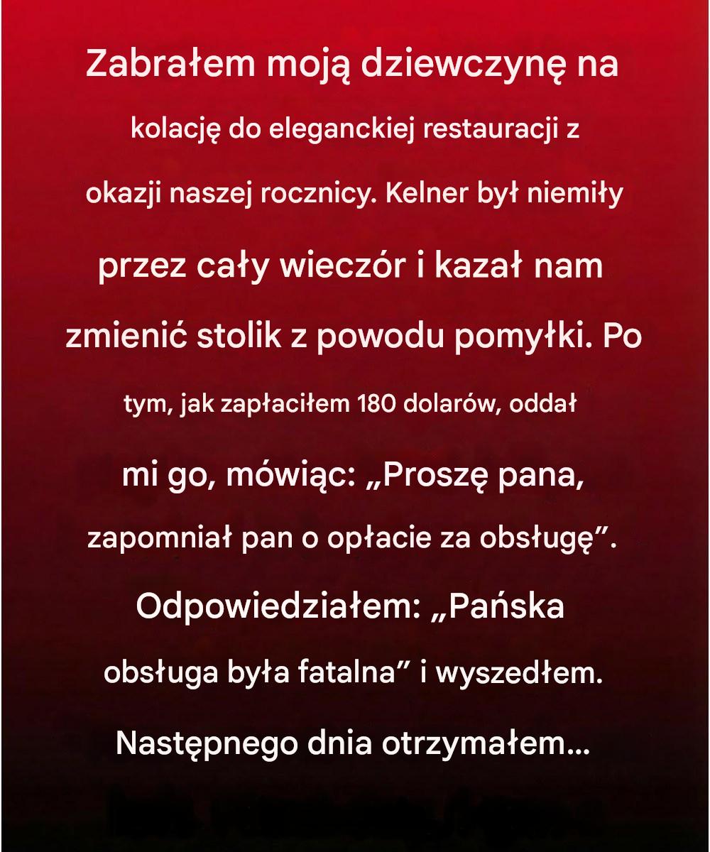 Ten wieczór miał być wyjątkowy, taki, który skrupulatnie planujesz, mając nadzieję, że pozostanie w pamięci na długo. Odkładałem pieniądze tygodniami, bez końca odtwarzałem w pamięci te rozmowy i wybrałem restaurację słynącą z dyskretnej elegancji. Przyćmione oświetlenie, nieskazitelne obrusy, lśniące kieliszki: wszystko obiecywało intymność i troskliwą obsługę. Kiedy moja dziewczyna pojawiła się uśmiechnięta i promienna, byłem pewien, że wieczór będzie dokładnie taki, jak sobie wyobrażałem.