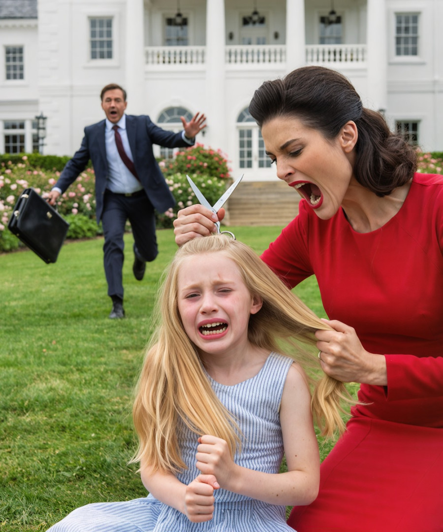 Zanim Sophie zdążyła odpowiedzieć, Claudia chwyciła nożyczki ze stołu w ogrodzie. Jej zimne palce zacisnęły się na ramieniu dziecka, ciągnąc je po trawie. „Stój spokojnie. Skoro nie potrafisz sama się uczesać, zrobię to sama”.
