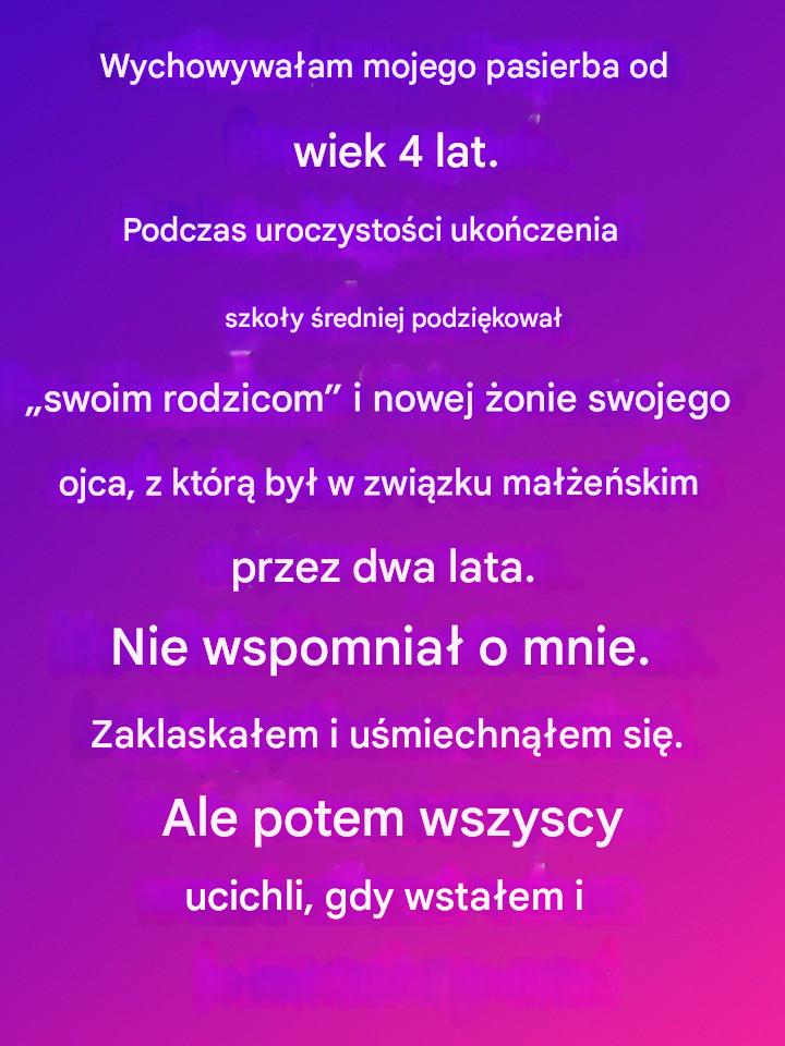 Moje serce było spokojne, bez smutku, bo miłości nie mierzy się publicznym uznaniem. Podchodząc do mikrofonu, zobaczyłem, jak oczy mojego pasierba rozszerzyły się ze zdumienia.