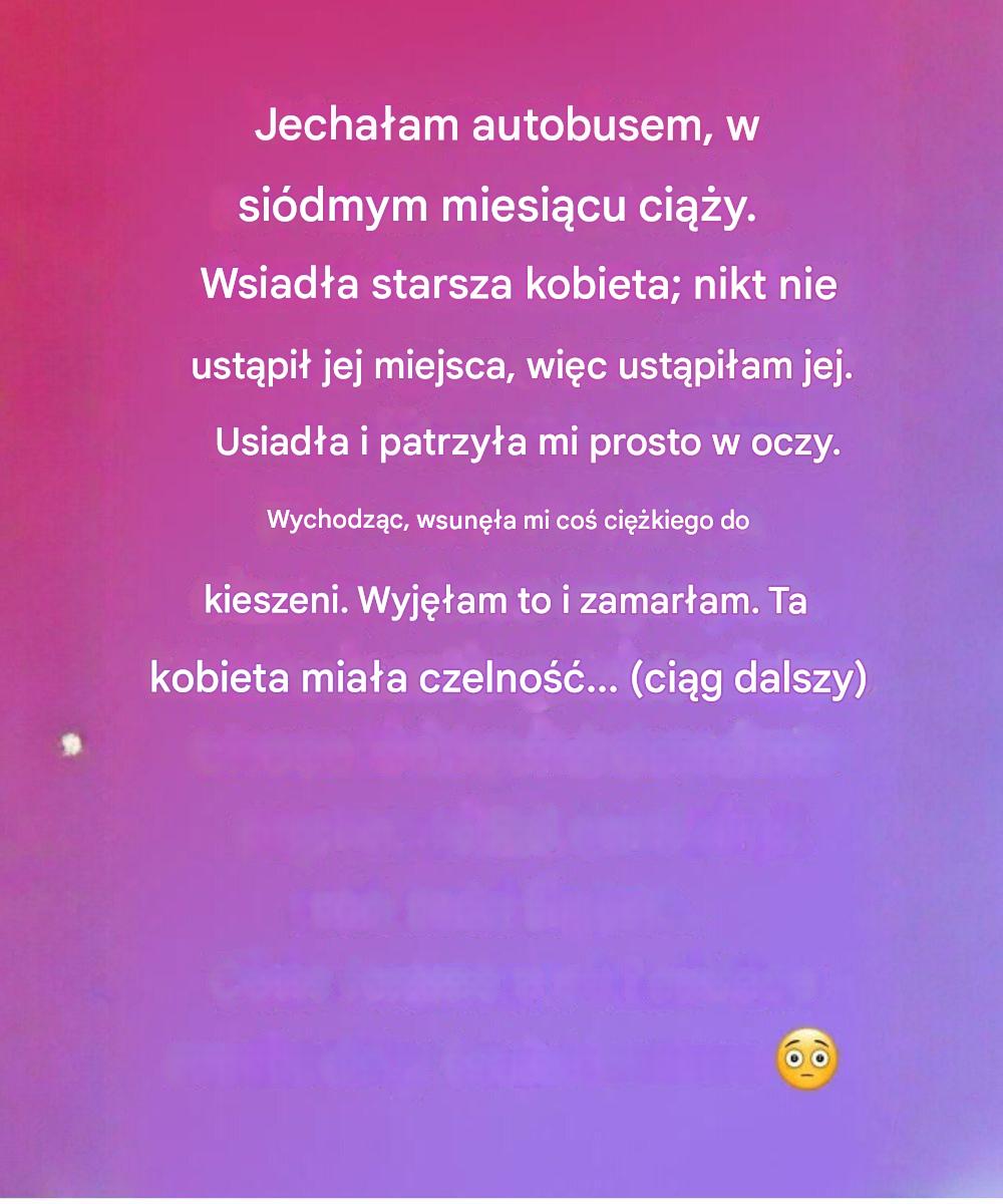 Podczas podróży od czasu do czasu czułam na sobie jej spojrzenie – nie po to, by mnie osądzać, ale z rodzajem czułego rozpoznania, jakby moja obecność budziła jakieś skrywane wspomnienie. Kiedy autobus zwolnił i zatrzymał się, starannie zebrała swoje rzeczy. Tuż przed wyjściem pochyliła się w moją stronę i wsunęła mi coś do kieszeni płaszcza. „Uważaj na siebie, kochanie” – mruknęła, zanim drzwi zamknęły się za nią, pozostawiając mnie zmieszaną i zaciekawioną.